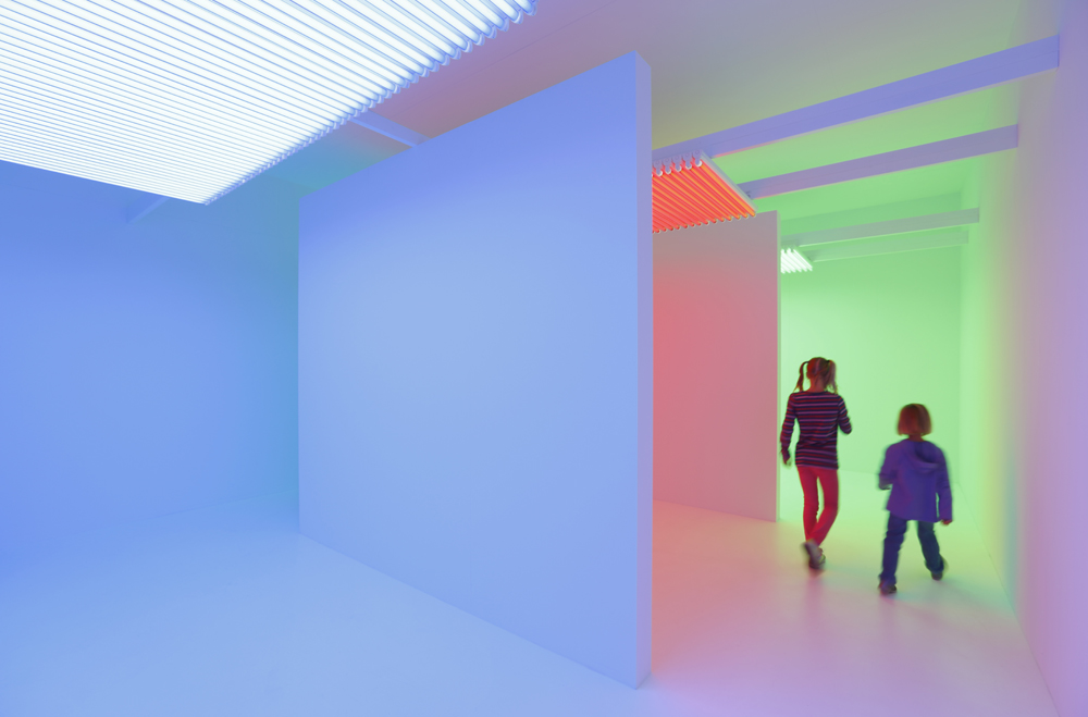 Ich trete ein und schon bin ich umflutet von warmem, blauem Licht. Es fühlt sich ein bisschen an wie unter Wasser, nur dass ich hier frei atmen kann – wie untergetaucht und gänzlich der Zeit enthoben, in der ich mich eben noch bewegt hatte. Aus dem angrenzenden Raum schwappt rotes Licht herüber, in das ich nun voller Erwartung eintrete, um mich von ihm genussvoll einlullen zu lassen. Nur widerwillig gehe ich weiter und werde in atmosphärisches Grün gehüllt. Mit erfrischten Sinnen entlässt mich die Installation „Chromosaturation“ (2010) von Carlos Cruz-Diez wieder in die Wirklichkeit.