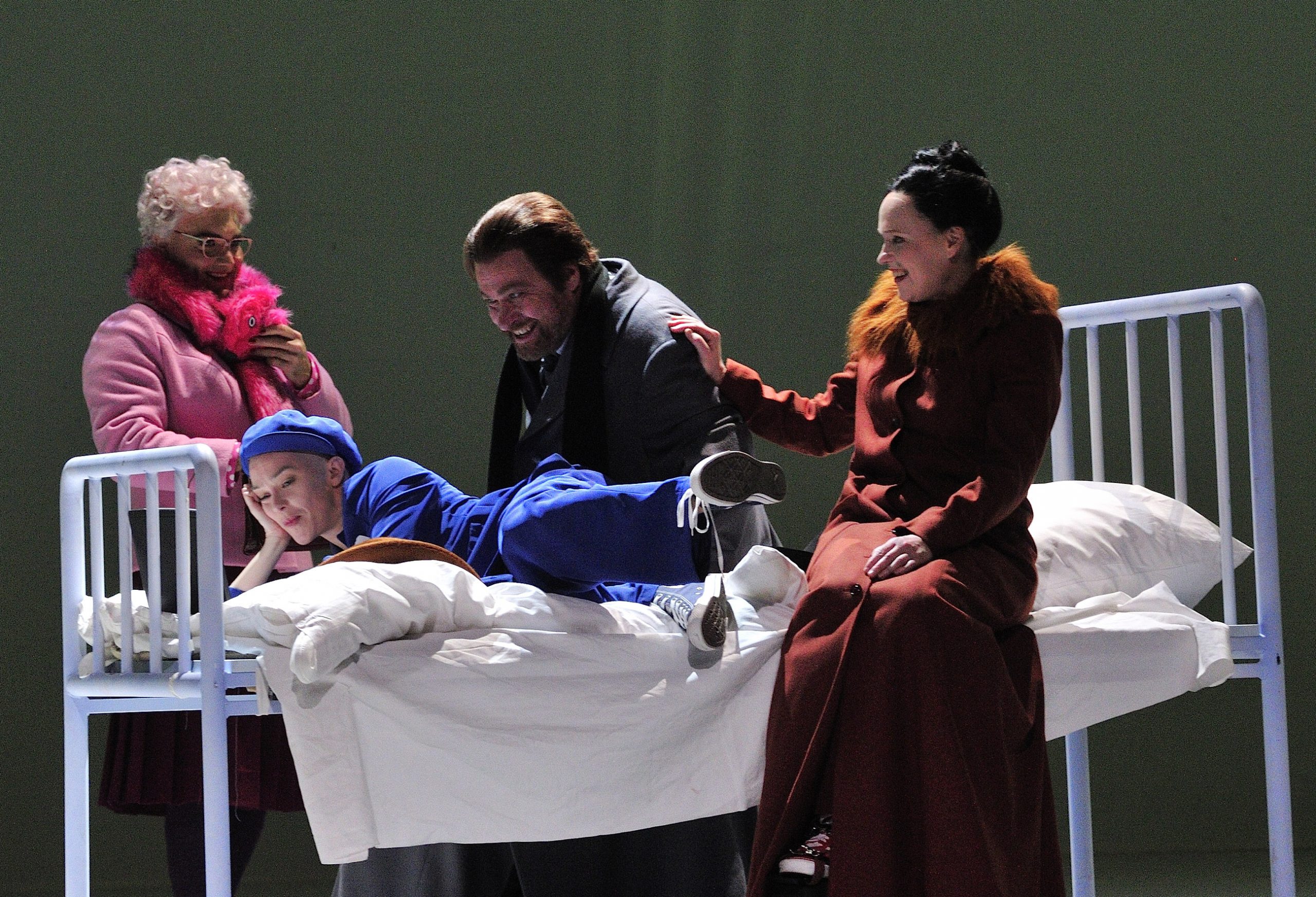 Bei den Gesangslinien achtet Bollon auf hohe Textverständlichkeit. Nie werden die Sänger vom Orchester erdrückt. Im Gegenteil – es sind oftmals die leisen, nur dezent begleiteten Passagen, die größte dramatische Wirkung entfalten. Die Orchesterbegleitung ist mit ihren Liegetönen und den schnellen, fließenden Pizzicati wie ein Band, das niemals reißt. Und die Oper, ohne ihr Gewalt anzutun, zusammenhält. Auch Humor hat diese Musik, wenn sie bei Popcorns (Christoph Waltle) Sehnsucht nach Salami einen Belcanto-Ton anschlägt, Xavier Sabata für einige Kraftausdrücke in die Bruststimme fallen lässt, in der Liebesszene von Oscar und Peggy Blue Tschaikowskys Schneeflockenwalzer aus dem „Nussknacker“ leicht verfremdend zitiert oder Oma Rosas witzig bebilderte Autofahrt (Video: Thilo Nass) mit einer spektakulären Koloraturarie in Szene setzt. Nur ein paar Mal entfesselt Fabrice Bollon das Orchester wie bei der Traumsequenz am vierten Tag, als zu virtuosen Streichern und treibenden Beats Peggys Operation und Hochzeit miteinander verschränkt werden. Am Ende löst sich diese Musik auf, wie auch die Briefe immer kürzer werden. Oscar liegt auf dem Sterbebett – und Bollon zaubert dazu einen schwebenden Klang, der bereits die Ewigkeit andeutet. Die mit stehenden Ovationen gefeierte Oper endet in der gleichen hellen Einstimmigkeit, wie sie begonnen hat.