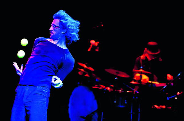 Das ist dann doch tiefgestapelt. Denn was das internationale Ensemble von Hyrrätytö im E-Werk zeigt (Regie: Stefan Schönfeld), ist staunenswert. Nicht, dass man den alten Zirkus nicht wieder erkennen würde. Das Tusch-Orchester wurde ersetzt durch eine Band (Bella Nugent, Roman Müller, Wolfgang Fernow, Schroeder), die ziemlich rockig die Nummern miteinander verbindet oder untermalt und Marcus Jeroch gibt den Conférencier mit Hang zur Hochkultur. Da darf Kafkas Erzählung über die Kunstreiterin „Auf der Galerie“ nicht fehlen und auch Texte von Enzensberger und Jandl rezitiert er. Wenn Jeroch zu Roman Müllers Bodenjonglage mit Diabolos über die Zeit im Allgemeinen und individuelle Lebenswege im Besonderen philosophiert, dann kommentiert sich beides gegenseitig.