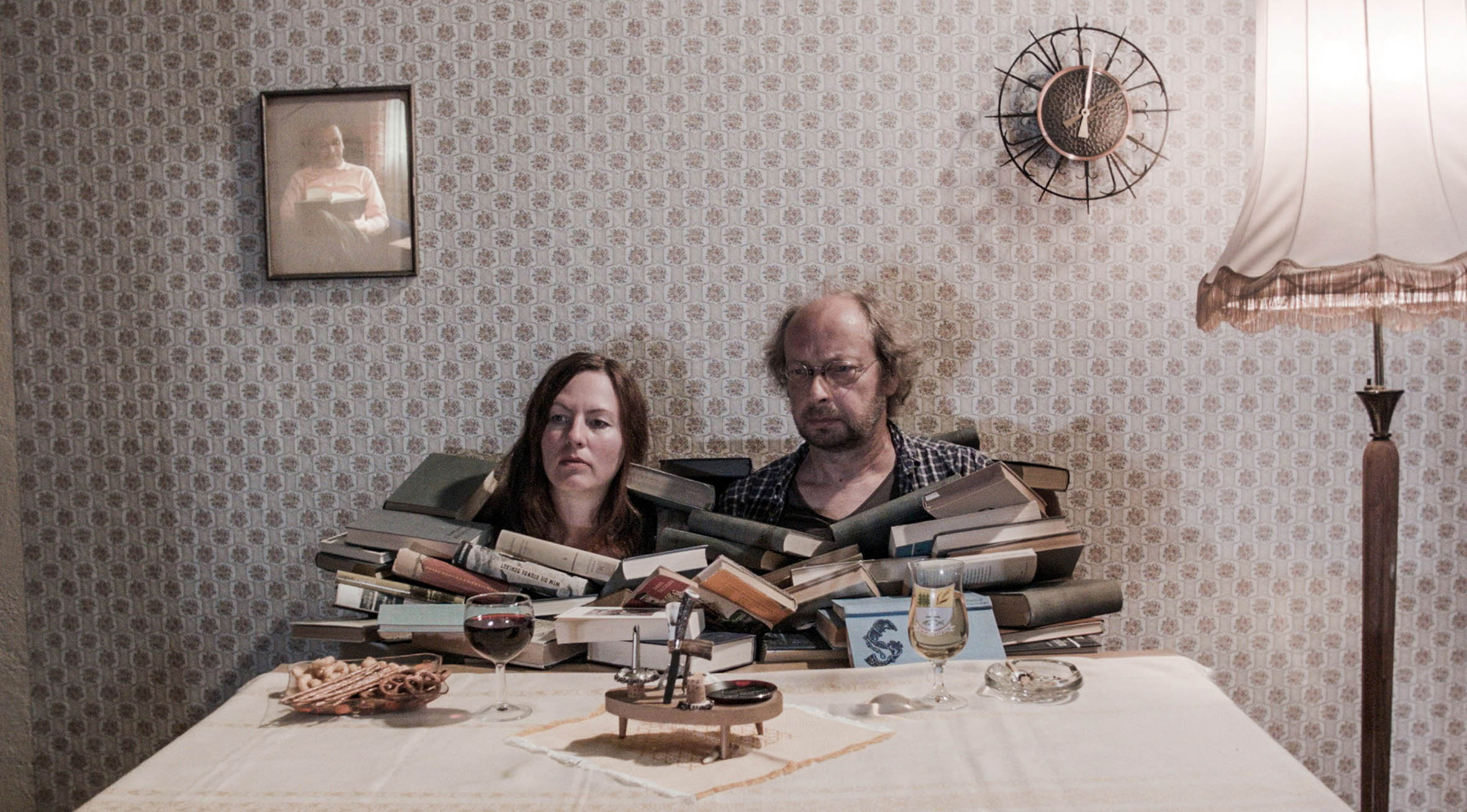 „Die Mechanik oder: Wie man auf sich Acht gibt“, am Montag (18.05.20) um 00:20 Uhr. Mutter (Beate Düber) und Vater (Matthias Zwarg ) sitzen vor einem Berg Bücher.
