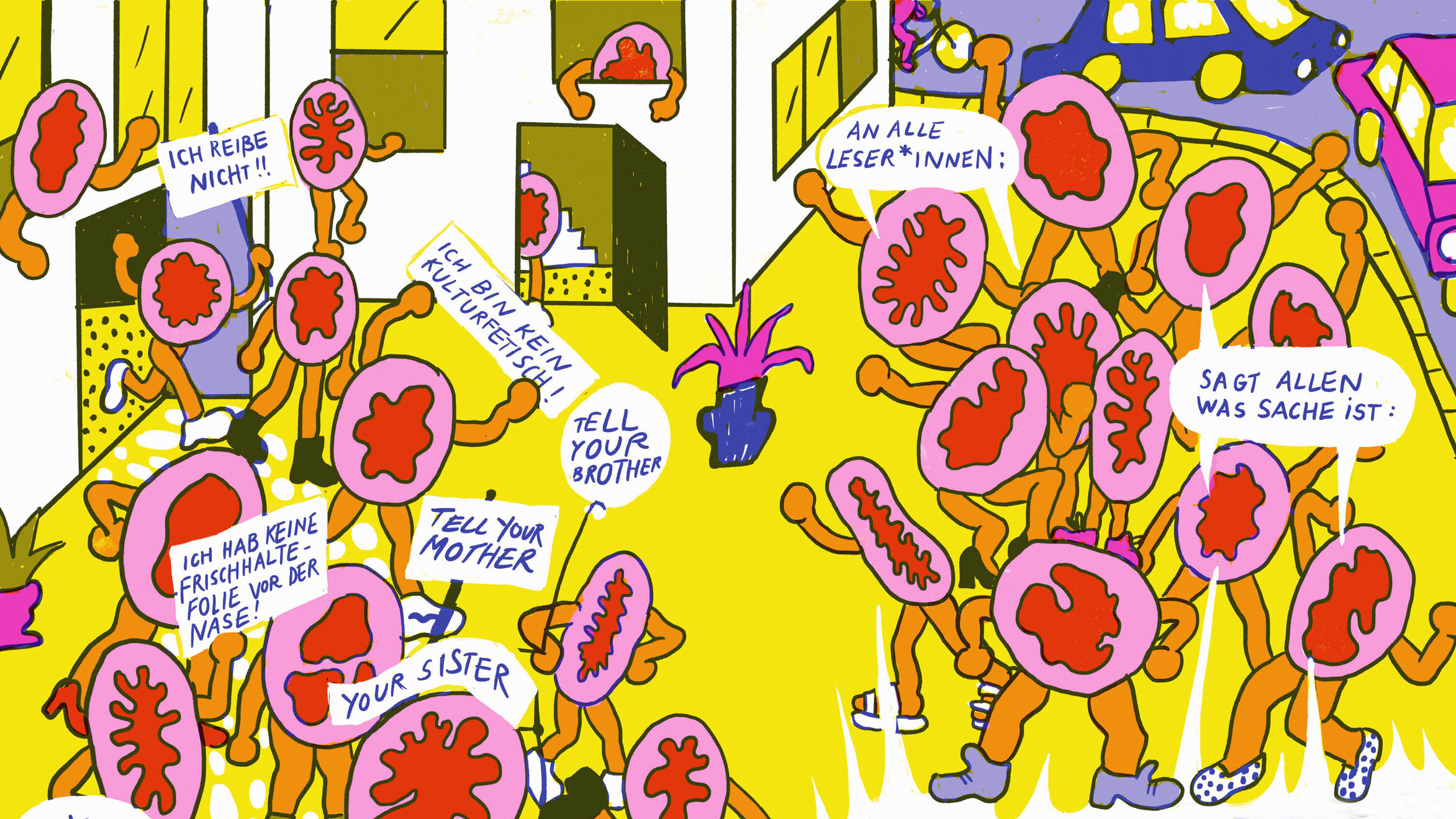 „Fluid Bodies“ meint nicht allein ein Verflüssigen von Körperbildern und Identitäten, der Ausstellungstitel benennt auch einen Zustand, der ungewiss ist und veränderlich. Die Arbeiten von „Fluid Bodies“ zeigen unwillentlich, wie groß die Trägheit der Körper ist. Statt Verflüssigungen sieht man viele Posen und Zeichen. Denise Blickhan überblendet Bildbearbeitungsprogramme über ihr Gesicht und die von JJ Levine porträtierten Mitglieder der queeren Community tragen sprechende Tattoos auf ihren Körpern. Und selbst den Oberteilen von Nicole Bachmanns Tänzerinnen der Performance „or what is“ sind Schriftzüge aufgedruckt. In der Bildhauerhalle führen die drei Frauen kleine Bewegungen aus, lassen Luft ab, zucken und sprechen Sätze, die den Körper thematisieren. Ziemlich sportlich sehen diese Bodenfiguren oder das Hangeln an der Wand aus. Mehr und mehr durchdringen sich Tanz und Sprache und münden in eine Bewegungs-Text-Kakophonie von geradezu dadaistischem Witz. Wenn JJ Levine in seiner Fotoserie Freunde und Bekannte auf Sofas und zwischen Zimmerpflanzen porträtiert und damit bürgerliche heterosexuelle Posen übernimmt, hat diese Statik etwas von Selbstbehauptung. Man sieht aber auch, politischer Aktivismus ist mitunter kein Spaß.