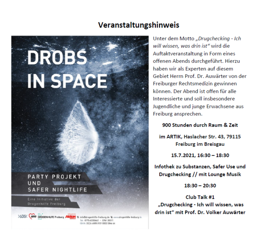 Drobs ins Space wird den temporären Kulturraum am 15. Juli nutzen, um ein Zusammenkommen aller Interessierten zu ermöglichen. Es gibt eine Info Lounge zu den Themen Safer Use und Drugchecking ab 18 Uhr sowie einen Club Talk mit Prof. Dr. Volker Auwärte von der Freiburger Rechtsmedizin unter der Überschrift „Drugchecking – Ich will wissen was drin ist“. Drobs in Space möchte einen Raum eröffnen in dem sich offen über Themen wie Drogenkonsum und Inhalte chemischer Rauschmittel ausgetauscht werden kann. Wenn gewünscht werden Beratungen zur Risikominimierung beim Konsumieren sowie auch zum Aussteigen geboten. Die Teams von Drobs in Space kommen auf Anfrage zu Veranstaltungen und in Clubs und bieten Gespräche und Infomaterialien.