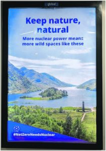 Auf dem Plakat sind in den Himmel über dem See die Worte geschrieben: „Bewahrt die Natur: Mehr Atomkraft bedeutet mehr Naturschauplätze wie dieser“. Am unteren Rand steht ein Hashtag – #NetZeroNeedsNuclear – ohne weitere Hinweise darauf, wer hinter dieser Werbung stecken könnte.