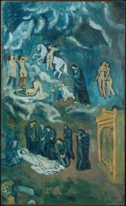 Man muss nicht die ganze Kunstgeschichte zur Präfiguration der Moderne erklären, doch natürlich bezieht sich Picasso ganz grundsätzlich auf die Malerei. So sagt er: „Ich habe das Gefühl, dass Delacroix, Giotto, Tintoretto, El Greco und der Rest wie auch all die modernen Maler, die guten und die schlechten, die abstrakten und die nichtabstrakten, alle hinter mir stehen und mich bei der Arbeit beobachten.“ El Greco jedenfalls gehörte lange nicht zum Kanon, erst zur Wende zum 20. Jahrhundert fand so etwas wie eine Neubewertung statt. El Greco selbst fiel spätestens nach „Die Anbetung des Namen Jesu“, das um 1577/79 entstanden war, bei Philipp II. in Ungnade. Der spanische König gehört selbst zu jenen, die El Greco kniend in Anbetung dargestellt hat. Auf einer zweiten Ebene haben sich die Engel um das Christuszeichen IHS gruppiert. Rechts jedoch von den Gläubigen reißt ein unheimlicher, riesiger Fisch sein Maul auf, um die Ungläubigen zu verschlingen. In „Evokation (Das Begräbnis Casagemas)“, das kurz auf den Selbstmord des Freundes 1901 entstanden war, variiert Picasso den zweigeteilten Bildaufbau. Während dunkle Gestalten, die sich gegenseitig stützend um den Freund trauern, bevölkern Prostituierte den Himmel. Eine der Frauen küsst einen Reiter auf einem Schimmel. Anstelle des Höllentors verweist ein Grabstein harsch auf das Unwiederbringliche des Todes. El Grecos christliche Themen tauscht Picasso gegen säkulare. Und nicht selten werden aus Heiligen Prostituierte.