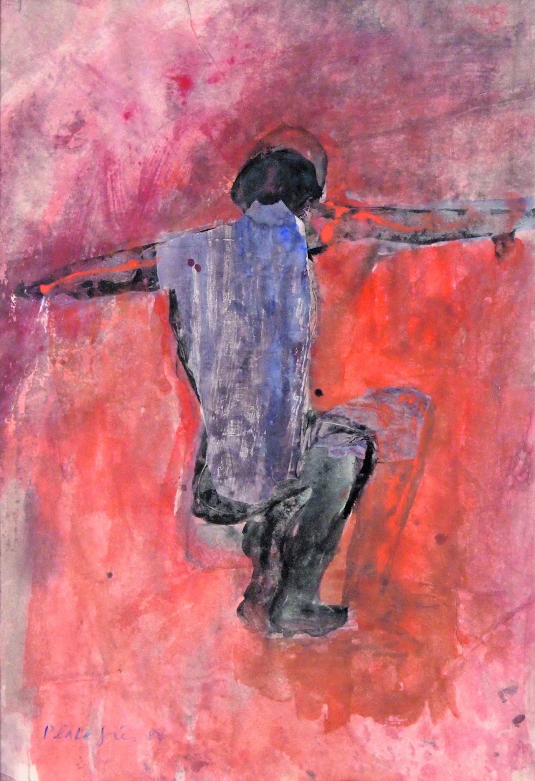 Wie sehr Plate-Gies im regionalen Kunstschaffen eine feste Größe war, lässt sich in der Auflistung der Ausstellungen in der begleitenden Publikation noch einmal nachvollziehen. Plate-Gies hatte an der Kunst- und Werkschule Offenbach studiert und im Anschluss Anfang der 1950er Jahre ihre Ausbildung an der Hochschule für Gestaltung Köln als Meisterschülerin abgeschlossen. Ihre Malerei ist keine geschmeidige Position. In ihrer unablässigen Thematisierung des Körpers steckt eine große Portion Beharrlichkeit. Und neben wenigen (Wolken)Landschaften liegt der Fokus dieser Ausstellung auf den Körperbildern. 1984 malt sie in Temperatechnik auf Reispapier einen „Springer“. Die Figur ist vom Betrachter abgewandt, hat die Beine angewinkelt, und um sich im Gleichgewicht zu halten, die Arme ausgestreckt. Schwach erkennt man auf dem roten Hintergrund eine Art Bewegungsbild der Figur. Als sei sie dem Abgrund schon ein bisschen näher. Sechszehn Jahre später entstehen auf einem ganz ähnlichen mit breitem Pinsel gemalten Hintergrund sechs Figuren, die in unterschiedlichen Positionen, mit unterschiedlichen Arm- und Beinhaltungen dargestellt sind. Es scheint als hätte sie unmittelbar an der früheren Arbeit angeknüpft. Die Körper, die sie malt, wirken so geschlechts- wie alterslos. Als seien es ständige Begleiter, die im Laufe eines Lebens sich weder verändert hätten noch aus sich heraustreten würden – alles Individuelle, jede Spur des Lebens ist hier ausgespart. Stephan Berg, der in der Katalogbroschüre mit einem Beitrag vertreten ist, versteht diese Figuren als „Erforschung der eigenen Befindlichkeit“. „Blick- und gesichtslos wie sie sind, wollen diese Körper nicht in erster Linie von uns etwas wissen, sondern von sich selbst“, schreibt er.