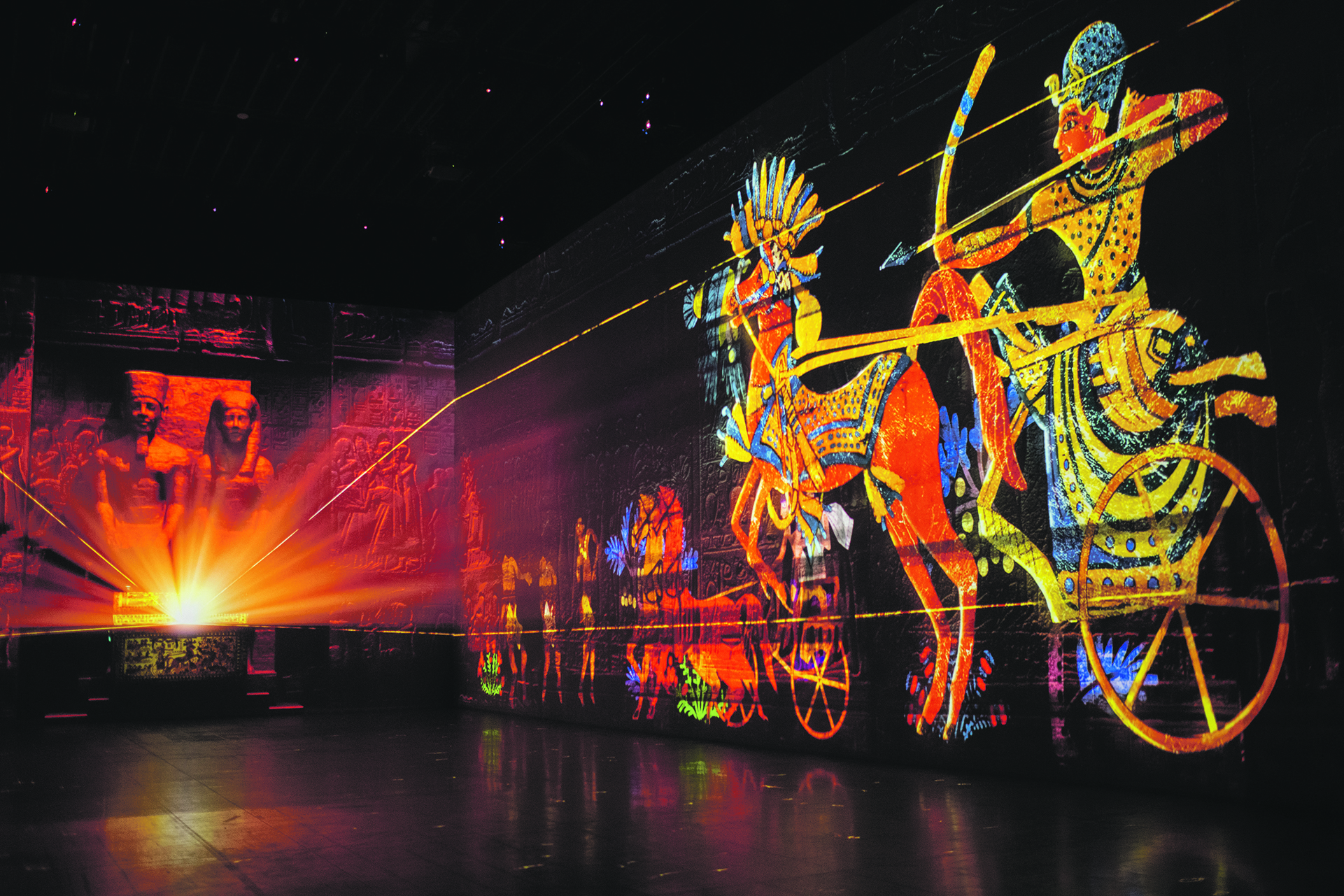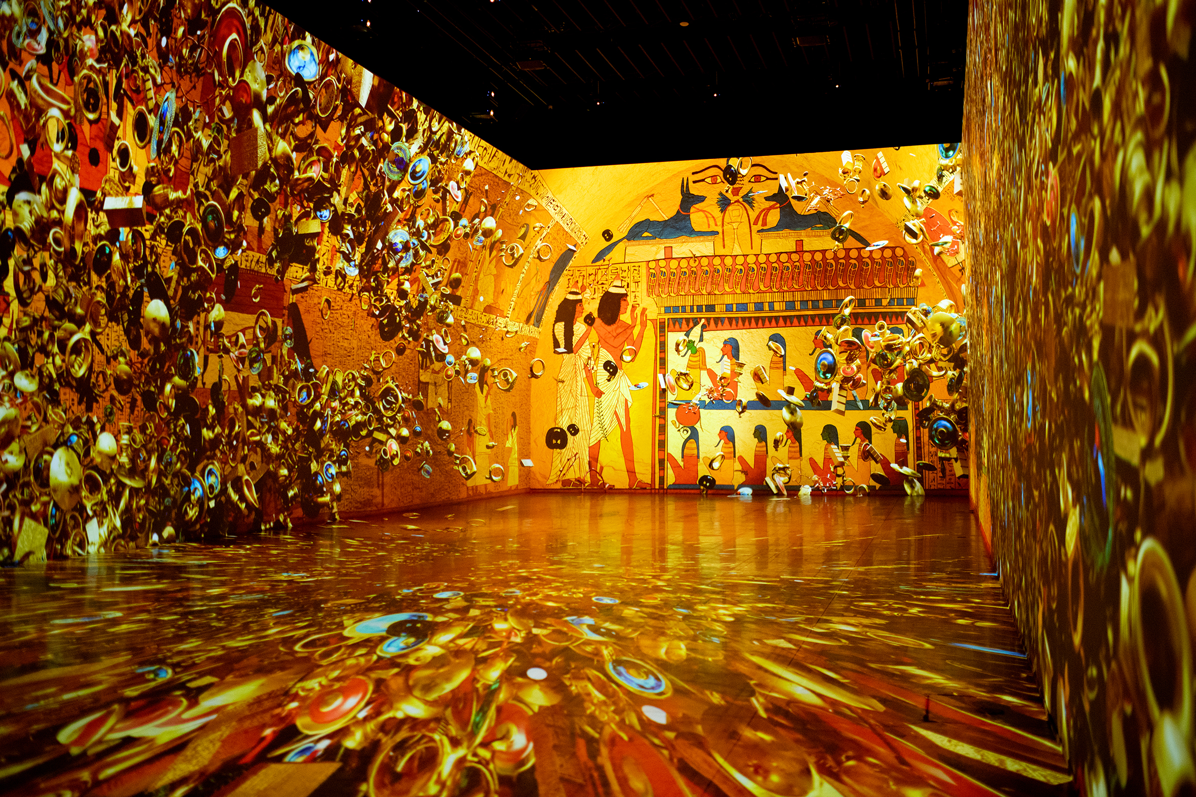 Im letzten und größten Saal laden Sitzhocker zum Verweilen ein, während die Gäste einen Zeitsprung zurück in die Vergangenheit machen. Dafür werden beeindruckende Bilder auf die Wände projiziert. „Ich bin der Pharao, ich bin ein Gott“, verkündet Tutanchamun. „Ich bin nicht tot, ich lebe.“ Sein goldener Thron schwebt majestätisch ein. Goldringe prasseln klimpernd zu Boden. Hummer und Salamander wuseln einem auf dem Parkett blitzschnell um die Füße herum. Die Betrachtenden kommen aus dem Staunen gar nicht mehr heraus. Auf einmal schippert man über den Nil – vorbei an Flusspferden, Wüsten, Palmen. Zeitweilig erklingt sogar die Originalstimme von Howard Carter, dramatische Musik löst sie ab. Wenig später malt eine Hand die großen Wandgemälde bunt. Was für Impressionen!