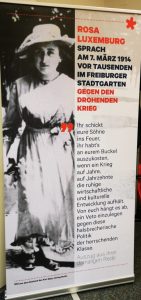Zum 110. Mal jährte sich am 7. März die Antikriegsrede Rosa Luxemburgs in der ehemaligen, 1944 zerstörten, Festhalle in Freiburg. Damals lauschten der Rede geschätzt 4000 Freiburger:innen, die sich in einer Zeit der Aufrüstung und Kriegsvorbereitung befanden. Gegen eben diese Entwicklungen plante Rosa Luxemburg gemeinsam mit ihrer (damals noch) SPD eine Rundreise, unter anderem mit Stopp in Freiburg. Nur 5 Monate später brach der 1. Weltkrieg aus, der den Beginn der nicht zu beschreibenden Kriegstragödien des 20. Jahrhunderts einläuten sollte.