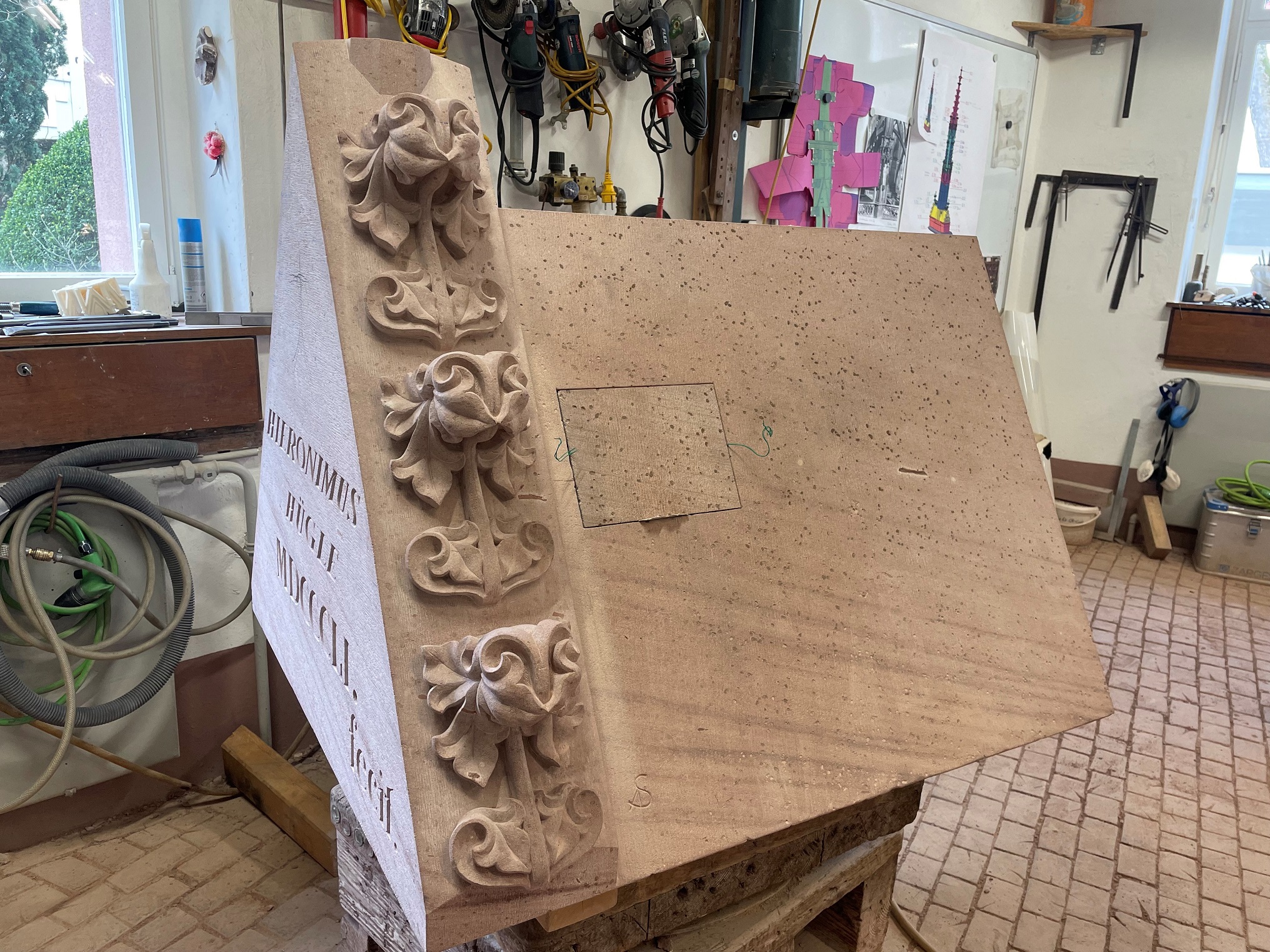 Nun kam bei einem großen Stein, der für den neuen Chor-Strebepfeileraufsatz 13/14 Süd gehauen wird, eine große Tonlinse zum Vorschein. Damit kein Wasser in den Stein eintritt, muss diese entfernt und ein passendes Stück Stein eingefügt werden. Ein idealer Ort für eine Zeitkapsel! Der Freiburger Münsterbauverein setzt auf die Kreativität von Schüler:innen, eine Nachricht für die Zukunft zu entwickeln, die hier hinterlassen werden kann.