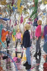 Da möchte man sich doch zur Erholung in die verlockend spielerische Welt von Daniel Knorr begeben. Ein Raum aus Spiegelfolie, in dem lauter poppig bunte, surreale Formen an unsichtbaren Fäden von der Decke hängen. Knorr hat die Ausschüsse einer Recyclinganlage für Kunststoffe in Hongkong gesammelt und mit Autolack angesprayt. Die Palette der Farben geht zurück bis in die 1960er Jahre. Der Künstler fand die entsprechenden Mixturen dafür. Knorr erinnern die wilden Formen an kalligraphische Zeichen, deshalb nennt er seine Installation „Calligraphic Wig“. Betreten ist ausdrücklich erwünscht, damit man ein bisschen wie Alice im Wunderland verzaubert zwischen den magischen Formen umherwandert. Im Grunde gilt das für die ganze Ausstellung, in der man mit Vergnügen die absonderlichsten Dinge und Vorgänge entdecken kann, vom Rennmotorrad, dem genau in der Mitte ein Teil fehlt, bis zu dem kleinen Mädchen, das einen roten Ball schweben lässt.