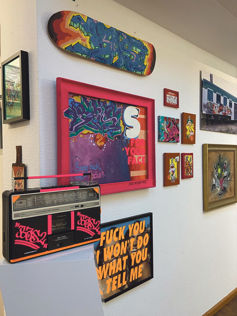 Gleich am Eingang erwartet die Besuchenden eine lauschige Ecke mit zwei altrosanen Retrosesseln, darüber steht in blasser Schrift „visuelle Reizüberflutung“ – das kommt beinahe wie ein Augenzwinkern daher. Denn für diese Ausstellung braucht man Zeit, am besten schnappt man sich einen Drink an der Bar und schlendert gemütlich durch die Räume. Zuckersüß und überraschend witzig sind Esfir Brods Zeichnungen. Die Katzenserien sind nicht nur niedlich, mit zensiertem After kommt sogar Gesellschaftskritik dazu. Eine herausragende Fotografie ist „Je Suis Un Femme Libre“ der Freiburger Fotografin Minz&Kunst, welche den Charakter des klassischen Fujifilms trägt – zu sehen ist eine Frau auf einer Straßenkreuzung, ihr Gesicht mit einem rosanen Tuch bedeckt, die Brust entblößt, ihren Körper umschmiegt ein weißes Gewand. Vorsicht, kann abfärben: Mitten im Raum lädt eine Bank zum Verweilen ein, aber obacht. Denn das schmucke Stück ist ein Werk der GHS Crew, konzipiert für die Ausstellung 2022/23 – zugleich läutet das Stück einen neuen Bereich der Ausstellung ein. Hier trifft man auf Streetart, bunt schillernde Drafts und ein bisschen Freiburger Graffiti-Geschichte. Dazwischen „Fuck you“ des anonymen Kollektivs Dies Irae, die Anfang diesen Jahres ihre Protestkunst im kulturaggregat zeigten.