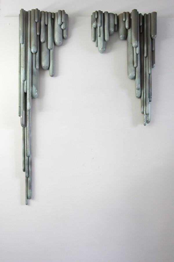 Eine Treppe hinab widmet sich „Fascination Glacée“ der Frage, welche Formen Wasser im gefrorenen Zustand annehmen kann: Eisberge, Schollen, deren Oberfläche beinahe einer optischen Täuschung ähneln, so sehr reflektiert ihre Oberfläche das Licht und lässt sie gefroren wirken. Prägnant sind Cécile Fouillades Werke, die während ihrer Residenz in Grönland entstanden sind. „Plage aux cétacés“ zeigt die Wirbel eines Belugawales – so fein ausgearbeitet und täuschend echt, dass man zweimal hinsehen muss. Besonders eindrucksvoll ist aber ihr zweites ausgestelltes Werk „Phoque annelé“. Hunderte kleine Keramikteile hat die Künstlerin aneinander genäht, wodurch eine Oberfläche entsteht, die beinahe perfekt das weiche Fell der Robben imitiert. Es sind heilige Tiere für die Indigenen Grönlands, der sich die Künstlerin in ihrer Arbeit mit sichtlicher Hingabe und Respekt annähert. „Stalaktos“ von Safia Hijos sucht den Dialog zwischen Natur und Architektur. Es wirkt poetisch, wie sich die Stalaktiten aus modeliertem und emailliertem Sandstein an die Wand schmiegen – kalter Stein wirkt auf einmal lebendig und dennoch eiskalt an der Oberfläche.