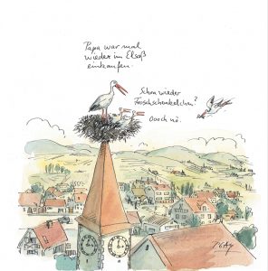 Zu den von Peter Gaymann geschätzten Kollegen gehören u.a. F.K. Waechter, Tomi Ungerer und Sempé; zu letzterem findet sich in der Schau in Lörrach eine reizend gezeichnete Hommage. Mehrere Cartoons persiflieren den Kunstbetrieb sowie berühmte Künstler wie Cezanne, Monet und Renoir. Gaymann kennt Frankreich, weiß, dass das Land als Reiseziel punkten kann, „Enten“ hier unter Artenschutz stehen und am Nationalfeiertag für die „Patrie“ eine Hühner-Batterie marschiert. Von Bordeaux bis Honfleur fachsimpelt man über Boulespielen und Wein, auch im benachbarten Elsass, wo sich ferner Störche grenzüberschreitend versorgen können. Im Schwarzwald kämpft man indessen gegen Funklöcher und heftige Wetter und lässt durch das etwas tumbe badische „He Jo“ aufhorchen, was Gaymann ebenso trefflich aufspießt wie das Markgräflerland, eine Art von Toskana, insbesondere laut Speisekarte, die „Leberle al dente“ und „Brägele fatto a casa“ anbietet.