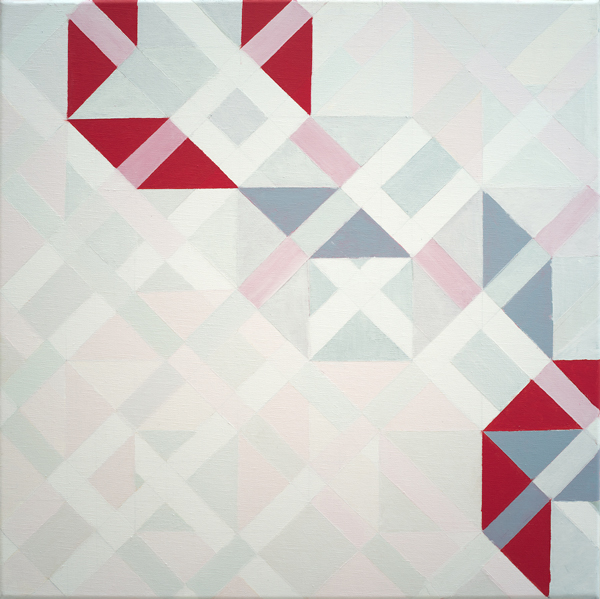 Im Hyperkubus entfaltet sich aus einem Kubus, der auf einen Fluchtpunkt bezogen ist, ein nächster mit einem neuen Fluchtpunkt und daraus wiederum ein nächster, wiederum mit neuem Fluchtpunkt. So entstehen zahlreiche Kuben. Je nach Perspektive changieren die Formen in verschiedene Richtungen und Winkel. Aus der Interaktion der Kuben entstehen unterschiedliche Flächen, die von der Künstlerin damm im zweidimensionalen Raum des Bildes ausgestaltet werden. Aus einem mathematischen mehrdimensionalen System wird so eine zweidimensionale, künstlerische Darstellung, die die Facetten des Hyperkubus sichtbar machen. Ildikó Csapó verfolgt mit ihren Farben den unterschiedlichen Abläufen der dabei entstandenen Muster. Sie wandert durch den Raum, hebt einmal das eine Element und ein andermal das andere hervor oder lässt die Flächen in unterschiedlichen Schichten weißer Farbe fast verschwinden. Die Vielfalt der Interaktion zwischen der zweidimensionalen Fläche und dem mehrdimensionalen Raum rückt so in den Vordergrund.