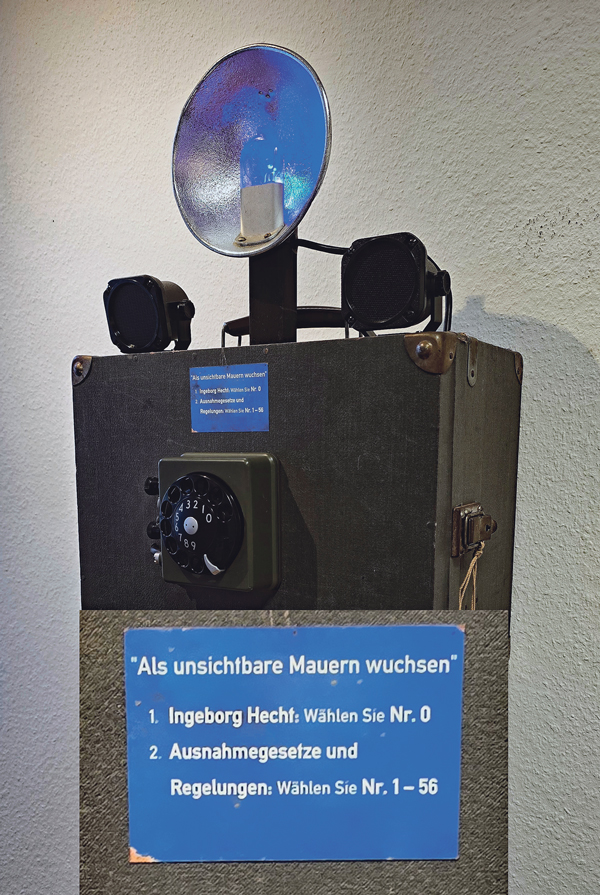 Herausstechend erscheint uns die Arbeit des Freiburgers Konrad Wallmeier, der mit seinen technisch-elektronischen Konstrukten, die stets einen tiefen Hintersinn bergen, auf sich aufmerkam macht. Er baute jetzt über einem alten Koffer, Symbol für Reise und Vertreibung gleichfalls, ein historisches Telefon, dessen Wählscheibe verschiedene Optionen bietet: Zahlen zwischen 1 und 56 können gewählt werden, jede Ziffer repräsentiert einen Paragraphen der NS-Rassegesetze, über einen Lautsprecher werden sie vorgetragen. Unter der Ziffer 0 erscheint ein O-Ton von Ingeborg Hecht. Das Blitzlicht oben leuchtet beim Näherkommen blau auf. Eine absolut geistreiche und hintergründige Idee und Installation!