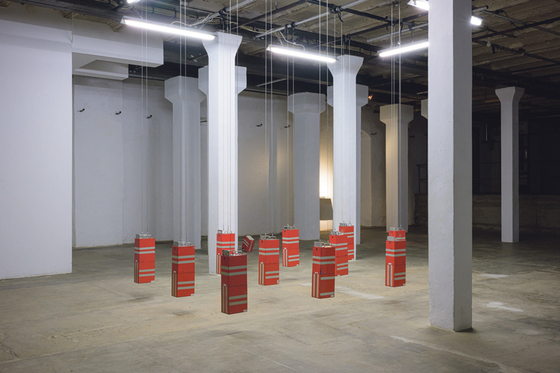„Groundwork“, so der Titel ihrer Ausstellung, verstärkt die unbehagliche Umgebung der Galerie II, was sich wiederum auf ihre Arbeiten auswirkt. Der Titel ließe sich mit Vorarbeit oder Fundament übersetzen und da sich ein Großteil der gezeigten Arbeiten mit dem Unternehmen Lockheed Martin befasst, das Waffensysteme entwickelt und weltweit verkauft, geht es auch um die Grundlagen des Krieges. Raumgreifend ist hier ihre Installation „Earwittness“, mit der sie 2022 begonnen hat. Zwölf Flugschreiber sind an Stahlseilen befestigt und hängen tief über dem Boden. „Do not open“ steht auf den rot-silbernen Quadern, von denen man immer nur dann etwas hört, wenn ein Unglück passiert ist. Ihre Fotoarbeiten „Without Echo“ gewähren einen Blick in schalltote Prüfkammern, in denen das Schall- und Signalverhalten von explodierender Munition getestet wird. Ein Spot richtet sich auf eine Aluminiumplatte die eine solche Amplitude des Schallverhaltens festhält. Ceidra Moon Murphy verlangt einer diskreten Industrie Zeichen ihrer Existenz ab.