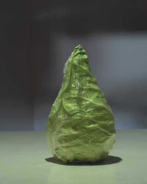 Lidong Zhaos kleinformatige Arbeiten der 2023 entstandenen Serie „Lebensmittel, Glanz“ wirken nicht unbedingt wie Lebensmittel. Natürlich sind sie weder regional angebaut noch saisonal in den Verkauf gelangt, sie entsprechen dem weit verbreiteten Anspruch, jederzeit auf jedes Produkt zugreifen zu können. Mehrere Rote Bete wurden zu einem merkwürdigen Körper zusammengedrückt, die grünen Chili sehen aus als seien sie eine Pflanze und der Brokkoli mit seinem Strunk ähnelt einem fatalen Atompilz. Darf man sich über Lebensmittel lustig machen, irgendwie hat ihre Form hier etwas unfreiwillig Komisches. Gut möglich, dass dieses praktisch proportionierte Gemüse im Supermarkt ansprechend präsentiert und vorteilhaft ausgeleuchtet wurde, auf Lidong Zhaos Fotos fehlt es hingegen an Licht. Auch wenn es so etwas wie Glanz auf den Zucchinis im Netz gibt, ist so gar nichts Anpreisendes um das Gemüse, es ist ein bisschen so als seien sie keine Produkte mehr. Doch alle stehen irgendwie, vielleicht auf einem grünlichen Untergrund, der Hintergrund ist mal weiß, mal grau, mal scheint irgendetwas zu reflektieren. Die Funktion des Zellophans ist hier weniger, das Gemüse frisch zu halten als ihm eine Form zu geben. Dadurch haben sie etwas von einem Objekt, das einen Schatten wirft. Die Betriebsamkeit einer Küche ist jedenfalls weit weg, es ist eine große Stille um sie.