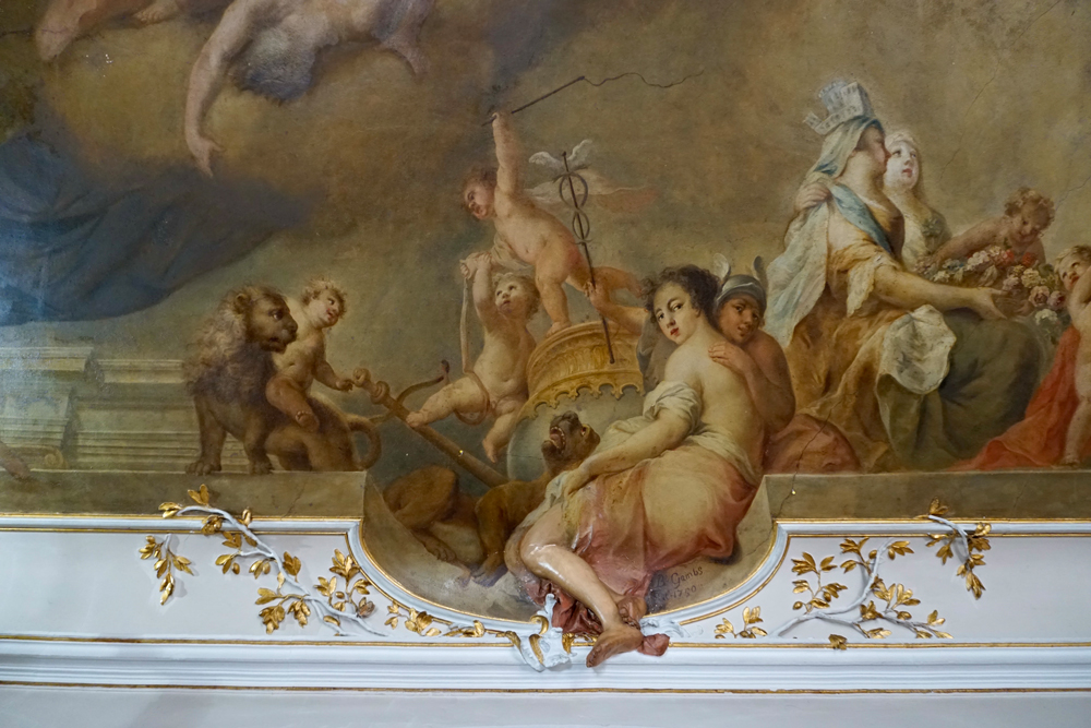 Zur Zeit wird der prächtige Gartensaal mit dem berühmten Deckenbild von Benedikt Gambs und dem herrlichen Blick in den viereinhalb Hektar großen Schlosspark restauriert Foto: Elisabeth Jockers