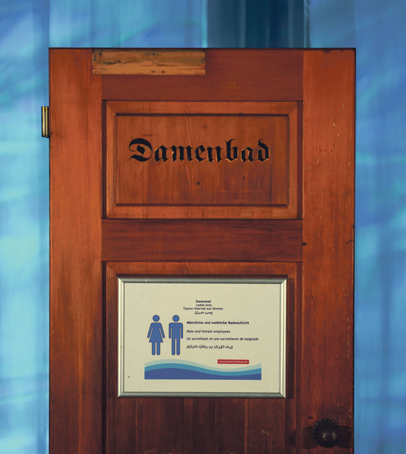 In dem Zusammenhang darf natürlich auch das „Loretto-Bad“ nicht fehlen: Das Bad im Stadtteil Wiehre geht auf das Jahr 1842 zurück. Das Schwimmbecken mit angeschlossenem Wirtshaus wurde vom nahen Hölderlebach gespeist. 1886 wurde die Frauenabteilung eingerichtet, angesichts großer Nachfrage. In den 1920er- und 1930er-Jahren wurde die Geschlechtertrennung erstmals in Frage gestellt. Eine Nutzerin schrieb in einem Leserbrief an die „Freiburger Zeitung“ vom 14.07.1927: „Männlein und Weiblein sind streng getrennt und in hoch eingeschlossenen Badeanstalten untergebracht (…). Damit wäre meiner Ansicht nach der Prüderie genügend Zugeständnisse gemacht. Aber das reicht der lieben Stadtverwaltung noch nicht. Es ist streng verboten, einen oder gar zwei Achselträger, selbst beim Liegen, zu öffnen, um sich gleichmäßig verbrennen zu lassen (…)“. Der Verleger der „Freiburger Zeitung“, Adolf Poppen, unterstützte die Forderung nach Aufhebung der Geschlechtertrennung in den 1930er-Jahren mit einer Pressekampagne und sammelte Unterschriften dafür. Die katholische Kirche wiederum versuchte, diesen Sittenverfall zu verhindern, allerdings ohne Erfolg. Um 1940 wurde der Herrenbereich des Lorettobades zum „Familienbad“ erklärt, das separate Damenbad blieb jedoch erhalten. Ende der 1960er-Jahre gab es erneut eine Kampagne für dessen Aufhebung, Studentinnen bezeichneten es als diskriminierendes „Ghetto“. Außerdem wurde das Damenbad zur „Oben-ohne-Zone“, wohingegen im Familienbad weiterhin Bedeckungspflicht besteht. Für die Stuttgarter Ausstellung wurde – sinnfällig – die hölzerne Tür zwischen den Geschlechterbereichen temporär demontiert und ausgeliehen. Dass dann einige der Beispiele aus der langen Serie „Damenbad“ der Freiburger Künstlerin Almut Quaas mitausgestellt sind, ist ebenfalls überzeugend.