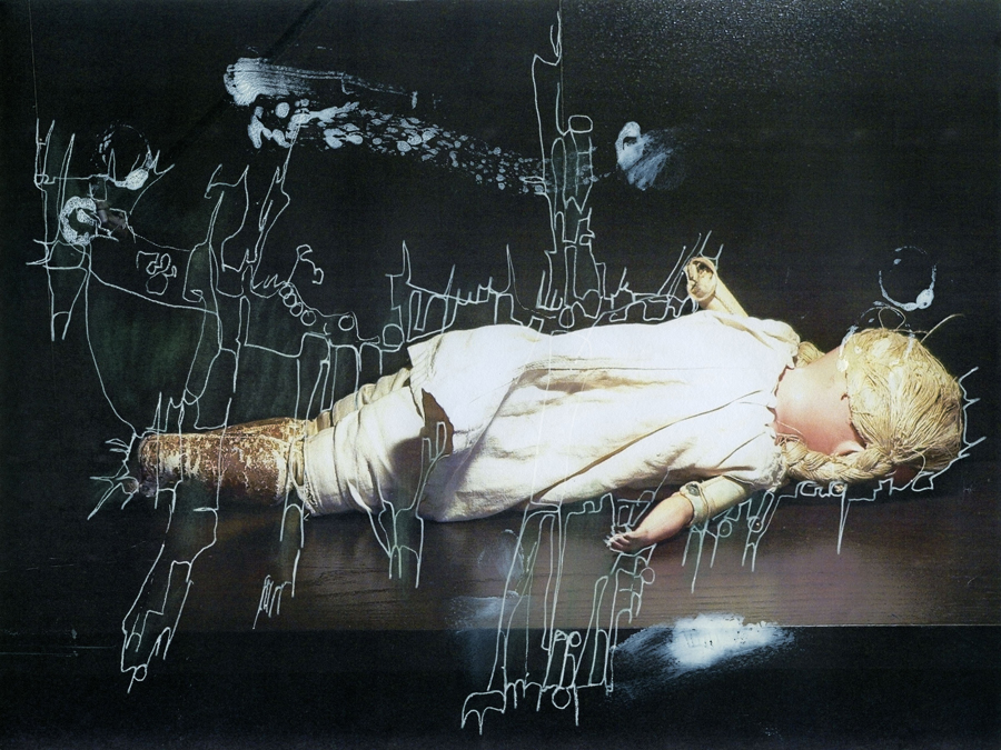 Beider erklärte Lieblingsfarbe ist Blau. Aber darüber hinaus divergieren die künstlerischen Vorlieben: Ludwigs Herzenskomponist ist Johann Sebastian Bach, Spätbarock, zugleich stringent aufgebaut und durchorganisiert. Almut steht auf Schubert, Brahms, Wagner – tiefste Romantik. Beide sind ein Künstler-Ehepaar, aber künstlerisch zusammengearbeitet haben sie selten: Eine Ausnahme bilden Arbeiten von 2015, wo Ludwig auf Fotografien einiger von Almuts Puppenbildern, die in früheren Jahren in Öl auf Karton in kleineren und mittleren Formaten entstanden, durch assoziative Überzeichnung in Weiß und Hellblau sozusagen seinen – meist linearen – ‚Kommentar‘ hinterließ. Sie nennen dies das „Netz des Hephaistos“ und spielen damit an auf den griechischen Gott des Schmiedehandwerks, der, so die mythische Überlieferung (bei Homer), ein nicht zerstörbares Netz aus goldenen Fäden über das Lager seiner versprochenen Gattin Aphrodite gelegt habe, die sich gleichwohl darin mit dem Rivalen und Kriegsgott Ares vergnügte, worauf Hephaistos sich von ihr löste. Offenbar gibt der gesuchte Titel auch ein Signal für die Untrennbarkeit der beiden heutigen Protagonisten.