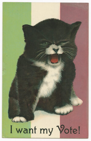 Von diesen Aufnahmen bis zur Rubrik „(un)abhängig“ ist es nur ein Katzensprung. Sie beschäftigt sich vor allem mit der politischen Auseinandersetzung in Sachen Gleichberechtigung von Frauen. Im viktorianischen England zum Beispiel stand das anhängliche Schoßkätzchen zumindest aus männlicher Sicht für das idealisierte (Haus-)Frauenbild in einer patriarchischen Gesellschaft. Weniger gut war die Straßenkatze beleumundet. Sie hatte den Ruf, nicht kontrollierbar zu sein. Dieses Image machten sich Briten oder auch Amerikaner zunutze, um gegen die Suffragetten zu integrieren. Auf Postkarten stellten sie sie gerne als räudige Katzen, die ihre Krallen ausfahren, dar. Mit der Intention, deren Kampf für das Frauenwahlrecht und Emanzipation ins Lächerliche zu ziehen. Auf diese Weise wurden Katzen für einen antifeministischen Kurs massiv verunglimpft.