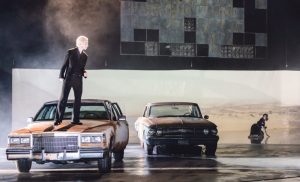 Das Donnergrollen verheißt nichts Gutes. Nebel zieht über die Bühne. Und ein amerikanischer Straßenkreuzer steckt im Boden. Noch bevor im Freiburger Theater ein Ton erklingt,