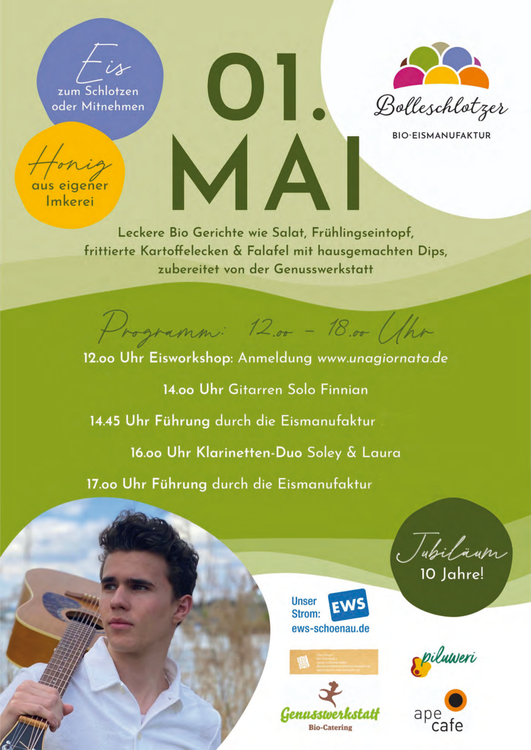 Die Bio-Eismanufaktur „Bolleschlotzer“ feiert in diesem Jahr ihr 10-jähriges Jubiläum. Deshalb gibt es am 1. Mai bei uns in Münstertal Live-Musik, gutes Essen, Kaffee und Gelato. Zudem bieten wir einen Workshop sowie Führungen durch die Eismanufaktur an, und es gibt einen kleinen Markt mit interessanten Ständen, unter anderem von der Demeter Gärtnerei Piluweri, der EWS aus Schönau – und mit Honig aus der eigenen Imkerei.