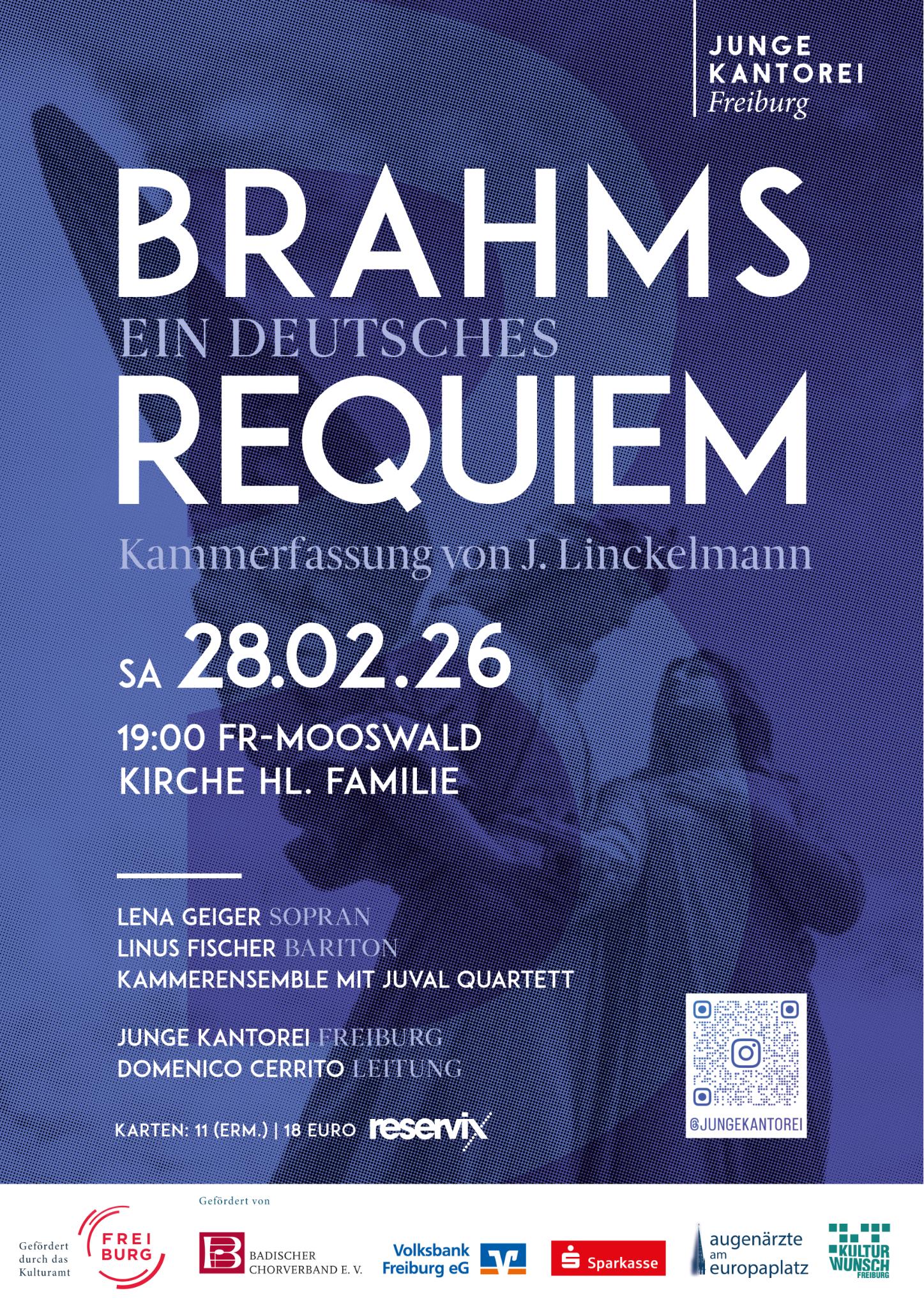 Die Junge Kantorei Freiburg präsentiert das Werk in der Kammerfassung von Joachim Linckelmann. Unter der Leitung von Domenico Cerrito gestaltet sie das Konzert gemeinsam mit der Sopranistin Lena Geiger, dem Bariton Linus Fischer und einem Kammerensemble, dem auch das juval quartett angehört.
