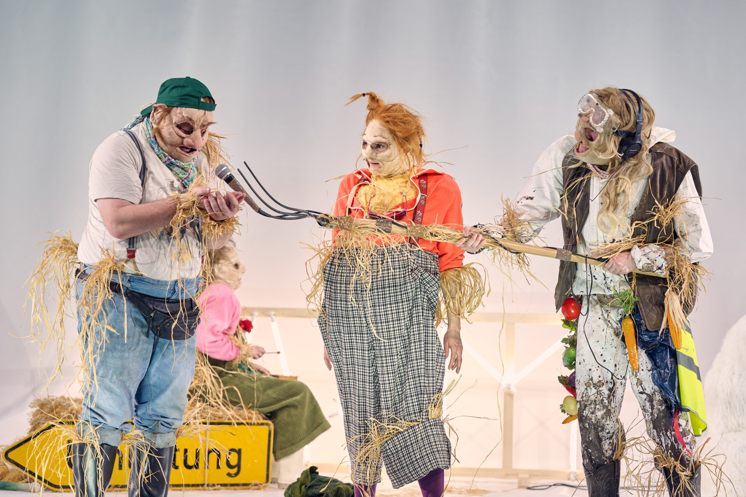 Es war einmal eine Farm. Eine Farm mit Feldern und Tieren und Menschen, aber das war vor der Klimakatastrophe. Jetzt leben auf der Farm nur noch fünf Vogelscheuchen. Weil es keine Vögel mehr gibt, vertreiben die Vogelscheuchen sich die Zeit nun anderweitig: Sie zeichnen die Klänge der aussterbenden Natur auf, bereiten Protestschilder vor und machen Musik, die sie übers Piratenradio in den Äther senden. Sie führen ein Interview mit der letzten überlebenden Biene und diskutieren ökologische sowie politische Themen wie Insektensterben und Pestizide. Dabei geben sie den Traum von einer besseren Zukunft niemals auf – und ganz nebenbei wird ein Ei gelegt. Der französische Regisseur Philippe Quesne hat einen ebenso aktivistischen wie traurigen, zarten wie katastrophalen, ironischen wie poetischen Theaterabend geschaffen.