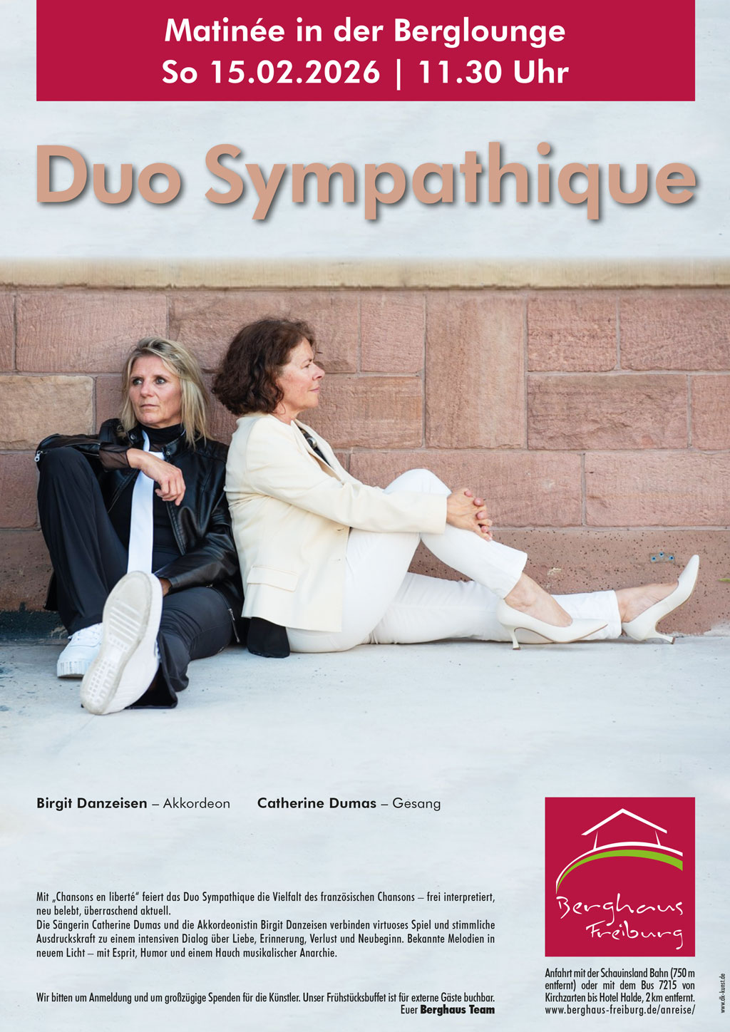 Die Sängerin Catherine Dumas und die Akkordeonistin Birgit Danzeisen verbinden virtuoses Spiel und stimmliche Ausdruckskraft zu einem intensiven Dialog über Liebe, Erinnerung, Verlust und Neubeginn. Bekannte Melodien in neuem Licht – mit Esprit, Humor und einem Hauch musikalischer Anarchie.
