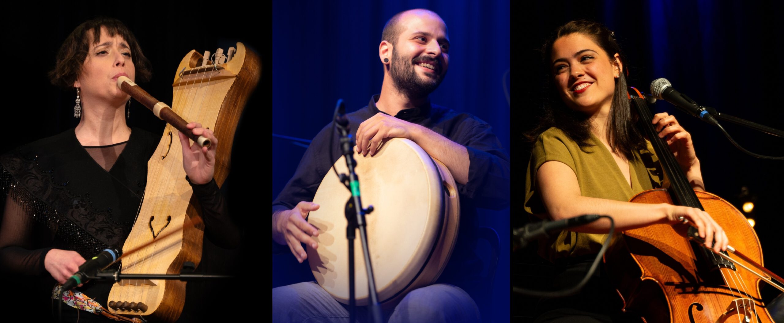 Drei Multi-Instrumentalist:innen schlagen augenzwinkernd den Bogen zwischen ihrem musikalischen Können und theatralischer Ironie. Freut euch auf diese humorvoll-beschwingte Reise zu den Wurzeln, wenn der rohe, uralte Puls sizilianischer Tamburine auf zeitgenössische Vokalexperimente trifft und okzitanische Klänge mit Kindheitsmelodien verschmelzen – durch eine scharfsinnige, schelmenhafte Linse neu interpretiert.